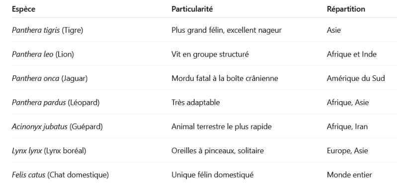 Les félins sont des mammifères carnivores de la famille Felidae, l’une des plus spécialisées du règne animal pour la chasse. Ce sont des prédateurs stricts, souvent solitaires, largement répartis sur la planète, et adaptés à des milieux variés : forêts tropicales, savanes, montagnes, déserts et même zones arctiques. Ils partagent un ensemble d’adaptations morphologiques et comportementales uniques.